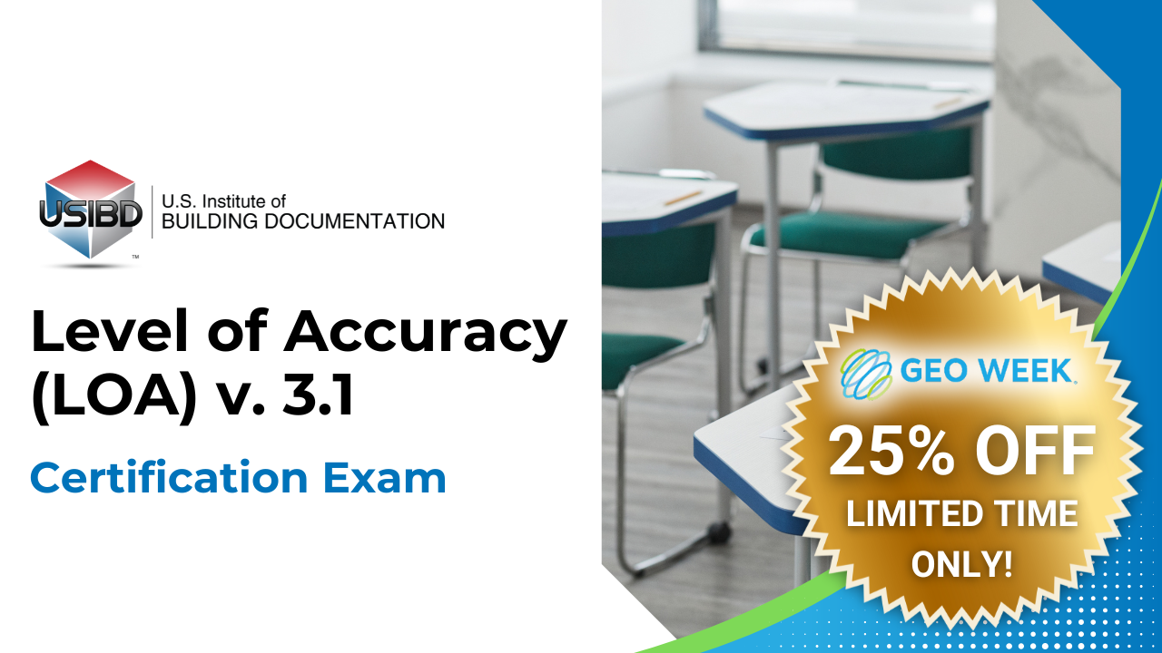 Validate your expertise with the U.S. Institute of Building Documentation’s Level of Accuracy (LOA) Specification v. 3.1 Certification Exam — now available with an exclusive 25% GeoWeek 2026 discount.